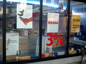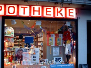 | The image on the left shows the window of a bank. Down left is a pharmacy. They have a gard uniform on the right from the traditional Ranzengarde. The nicest window I saw today is in a Café near the Dom down right. |