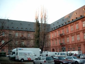 This is the castle in Mainz, where the splendour session (Prunksitzung) is taking place in the big hall. The parking spot is already full with the cars from broadcasting and TV.