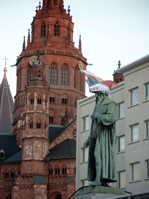 Also the monument of Mr. Gutenberg, inventor of book printing and the most famous son of the town has to live with cap and bells in these days. In the background you see the big roof tower of the cathedral (called Dom).