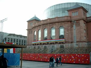 Gutenberg is looking down from his monument to the square in front of the theatre. There, everything is already installed for the big parade on Monday. Buses do not go anymore on this way through the city centre, but have been directed via additional stops around. |