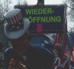 | In fact politicians are usually the victimes of the jokes they make. A very hard one this year. During Iraq war our government under chancelor Helmut Schroeder was against the war and the clear majority of the population as well. Relation to the American government was not the best. But the leader of the opponent party went to Washington trying to be good friend. The population was very angry about the (sorry!) 'ass-kisser' Angela Merkel. And now after the election, there was a 'Wiedereröffnung' (re-opening) |