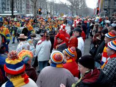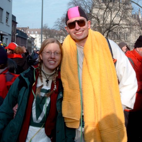 This is me and my colleague Charlotte in the Centre of Mainz at "Rosenmontag" (rose Monday). I thought about dressing as bath attendent on the beach of Mallorca. :-) The only problem was it was a bit cool (3°C). So I needed a few clothes below the bathing robe. To show the dimension: Mainz is a mid-size city of 150,000 inhabitants. About 9,000 active people go in the parade in 150 groups and wagons. About half a million guests are on the streets, coming from all places around to Mainz. Well ... lets start ...