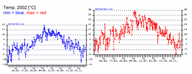 | Minimum (blue) and maximum (red) temperatures in Virgen are shown above in °C for the year 2002. 2003 was unusually hot in Europe and not representative. The climate is typical for the southern side of the main chain of the Austrian Alps, called "Hohe Tauern". While the parts in the North usually get more rain, the south is more sunny and little warmer. Often the high mountain peaks are in clouds but the rain does not make it to the southern side and goes down in the valleys in the North. |