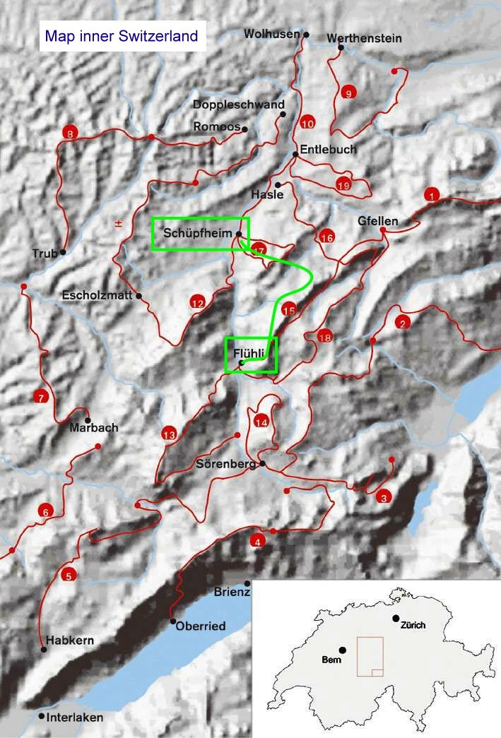 The map on the left shows the part of inner Switzerland where we made our walk. If you click on it you get a wider overview where in Switzerland the region is located. |