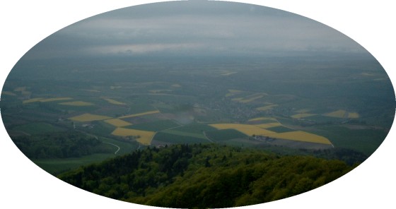 | The landscape around Schaffhausen as seen from a view-point on one of the hills: fields, forest and little villages.